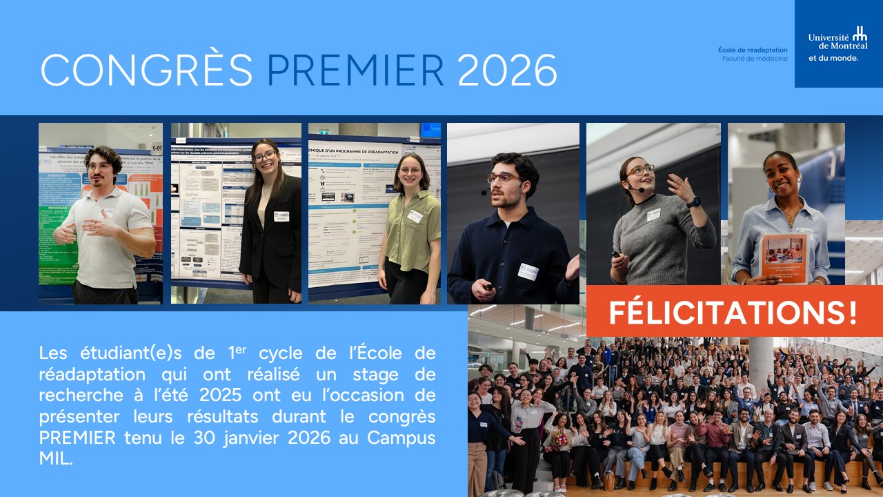 | Jasmine Arel, étudiante en physiothérapie Sous la supervision du Dre Dany Gagnon Centre de recherche interdisciplinaire en réadaptation du Montréal-Métropolitain (CRIR) Titre du projet : Fatigue musculaire localisée aux membres supérieurs associée à la performance d’un test d’effort sous-maximal d’intensité progressive réalisé sur tapis roulant motorisé chez des usagers d’un fauteuil roulant manuel. |
