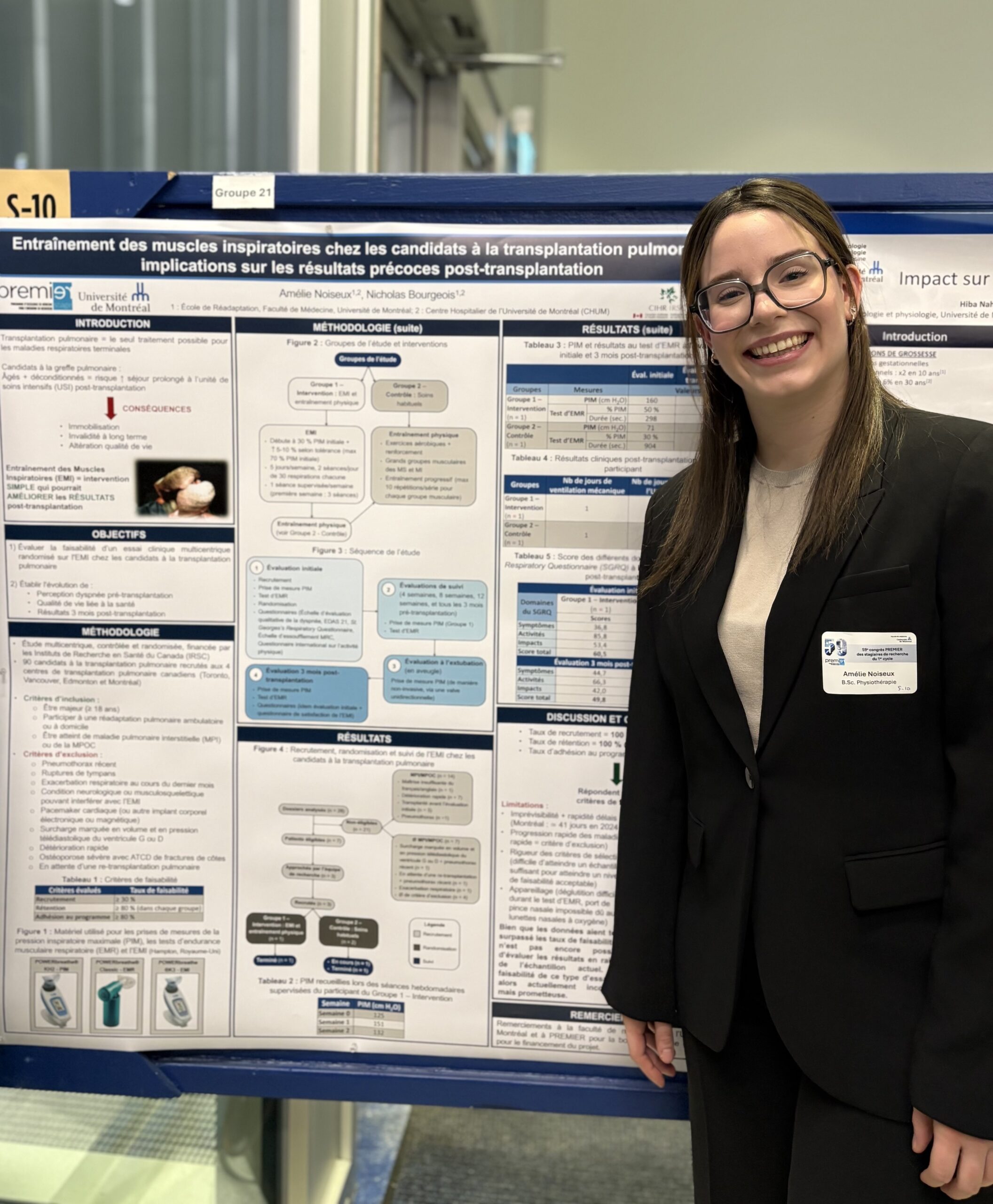 Amélie Noiseux, étudiante en physiothérapieSous la supervision de Nicholas Bourgeois, pht, Ph. D. Centre de recherche : Centre hospitalier de l’Université de Montréal (CHUM) Titre du projet : Entraînement des muscles inspiratoires chez les candidats à la transplantation pulmonaire Prix d’excellence pour présentation par affiche |