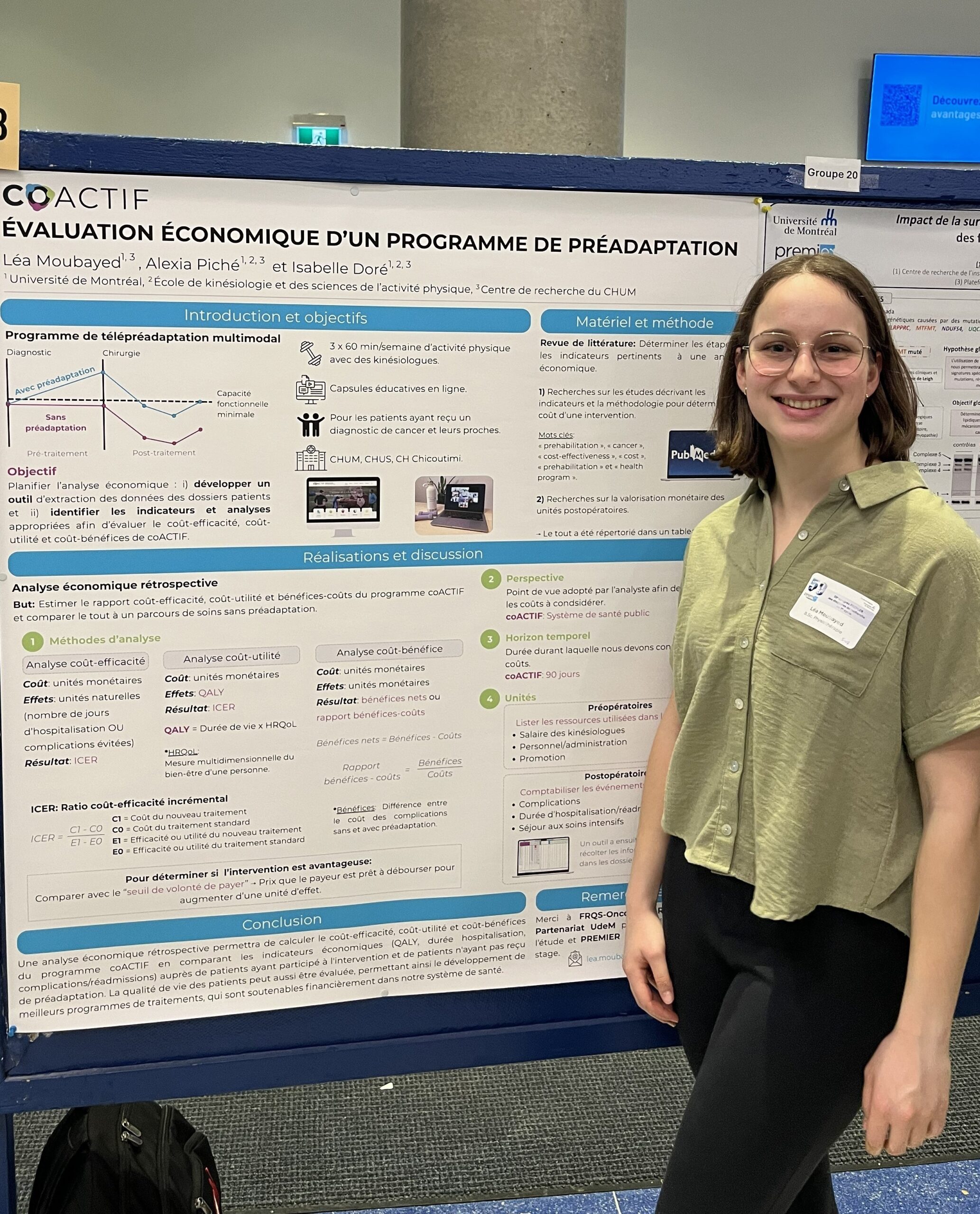 Léa Moubayed, étudiante en physiothérapieSous la supervision de Isabelle Doré, Ph. D. Centre de recherche : Centre de recherche du Centre hospitalier de l’Université de Montréal (CRCHUM) Titre du projet : coACTIF : Évaluation économique d’un programme de préadaptation |